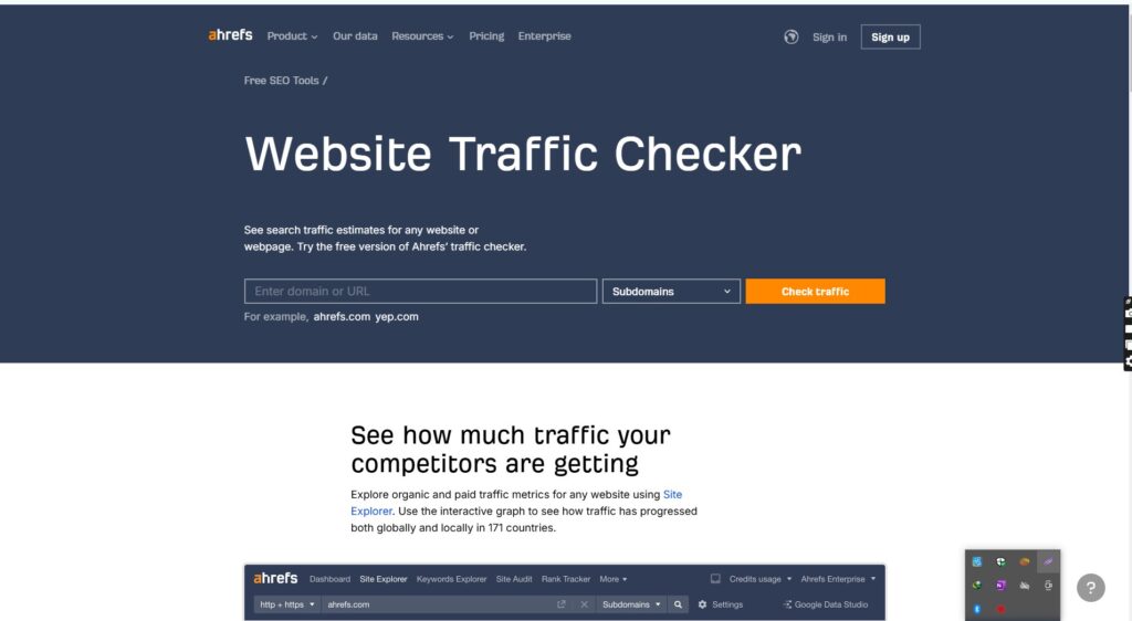 Here we can chek the traffic of our website with free version of ahref traffic cheker